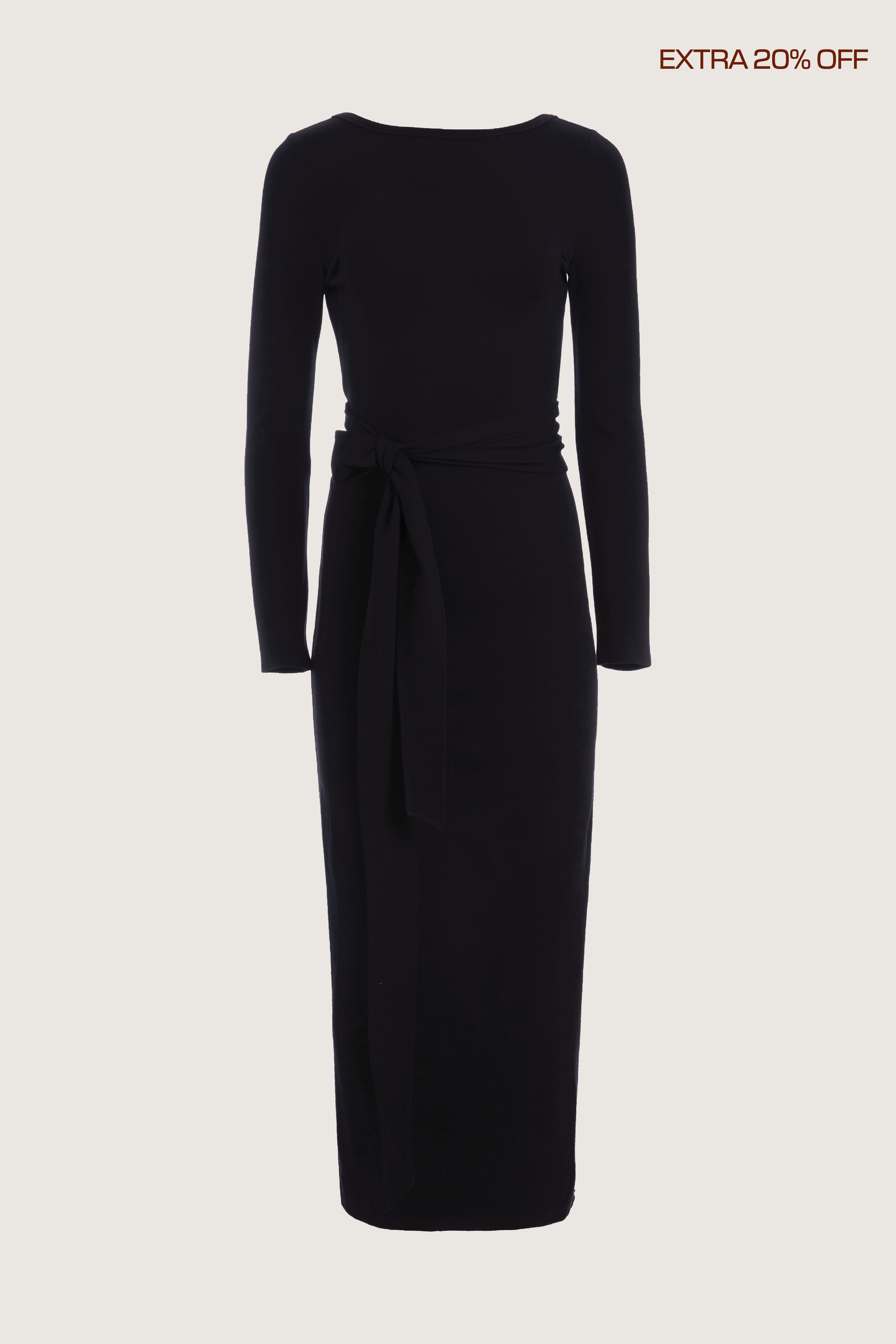 This wrap dress features a fixed belt at waist and plunging open back. Crafted from a stretch ponte fabric, hidden zips at sides provide option to vent. Size down for a snug fit.