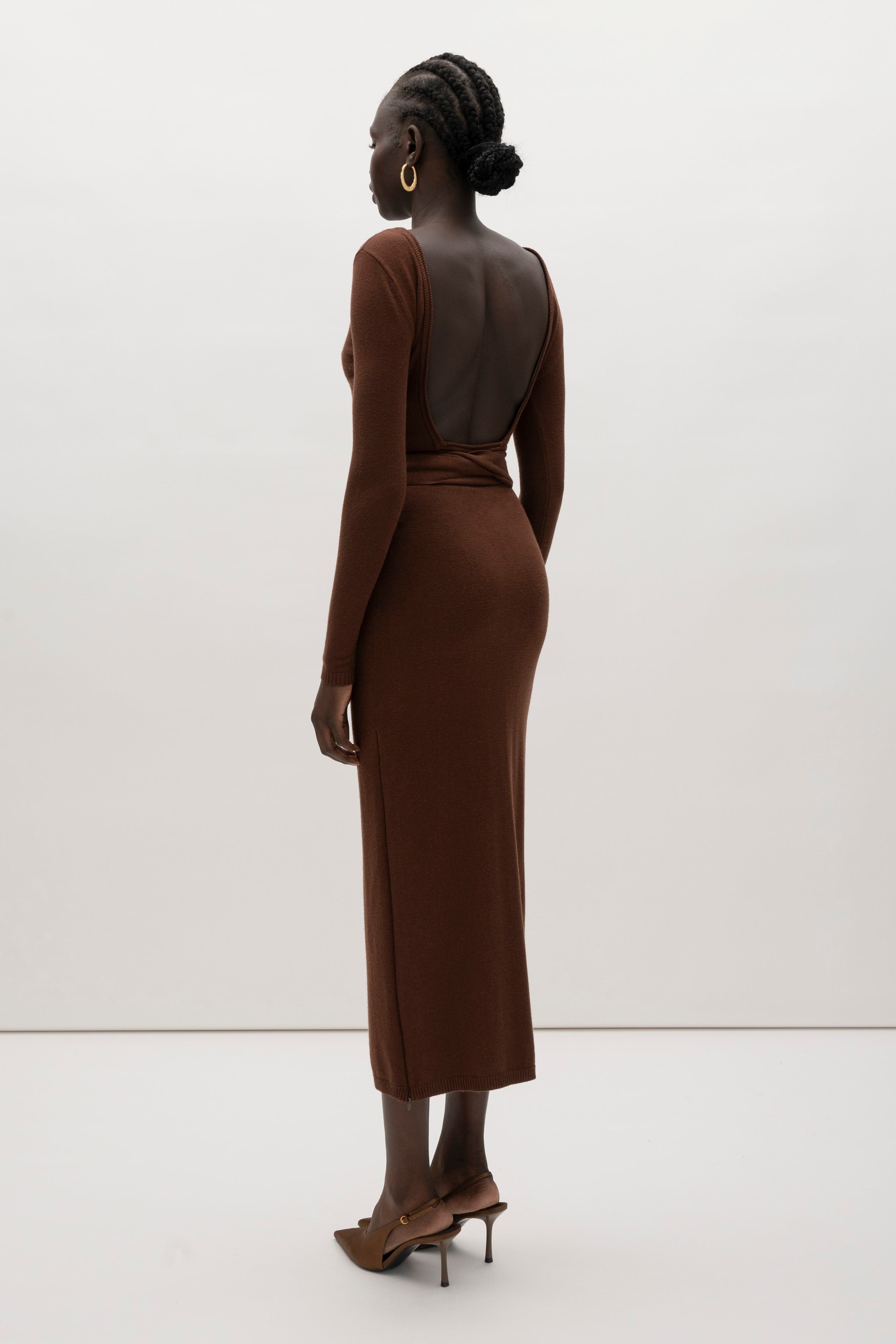 This wrap dress features a fixed belt at waist and plunging open back. Crafted from a luxe cashmere blend, hidden zips at sides provide option to vent. Size down for a snug fit.