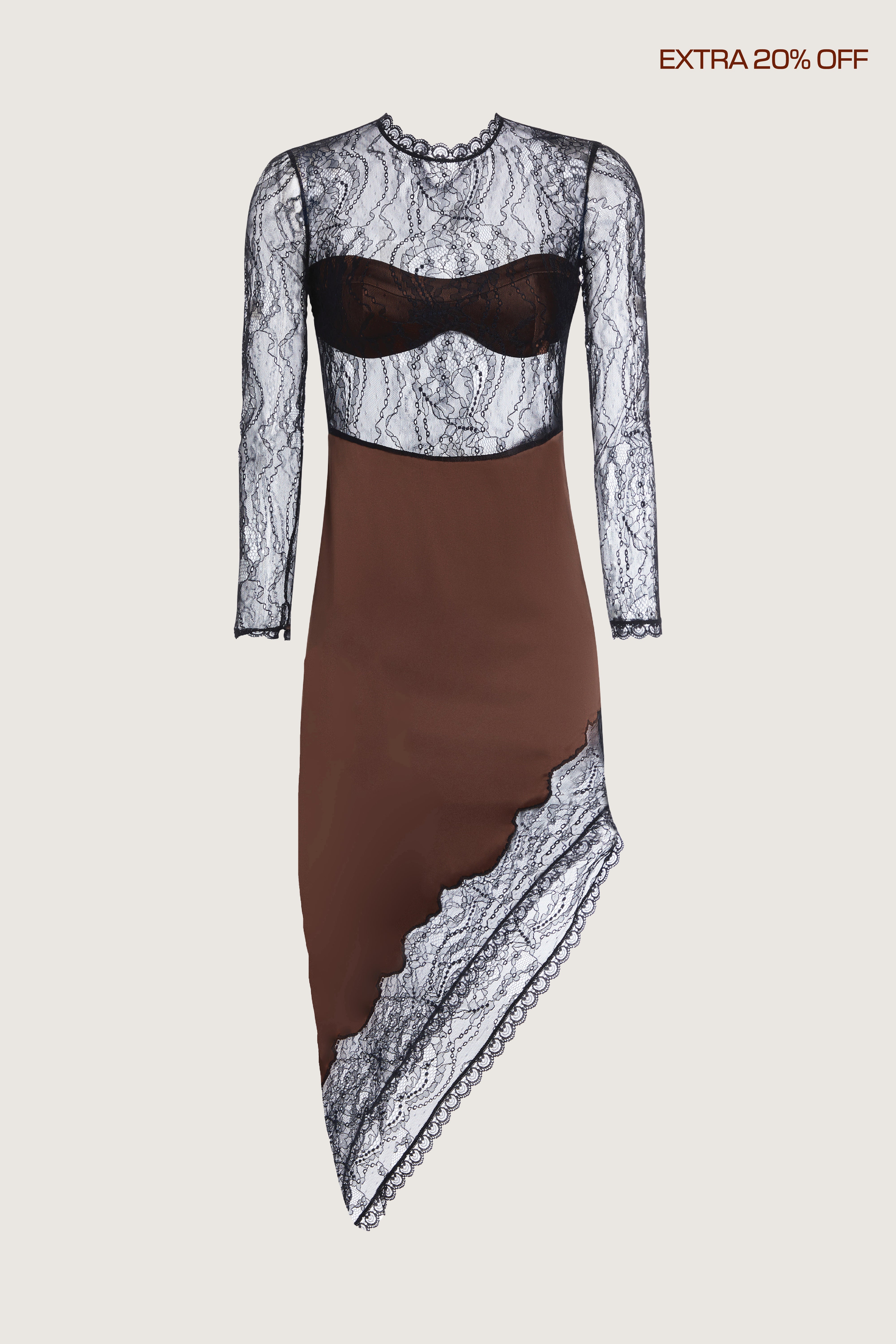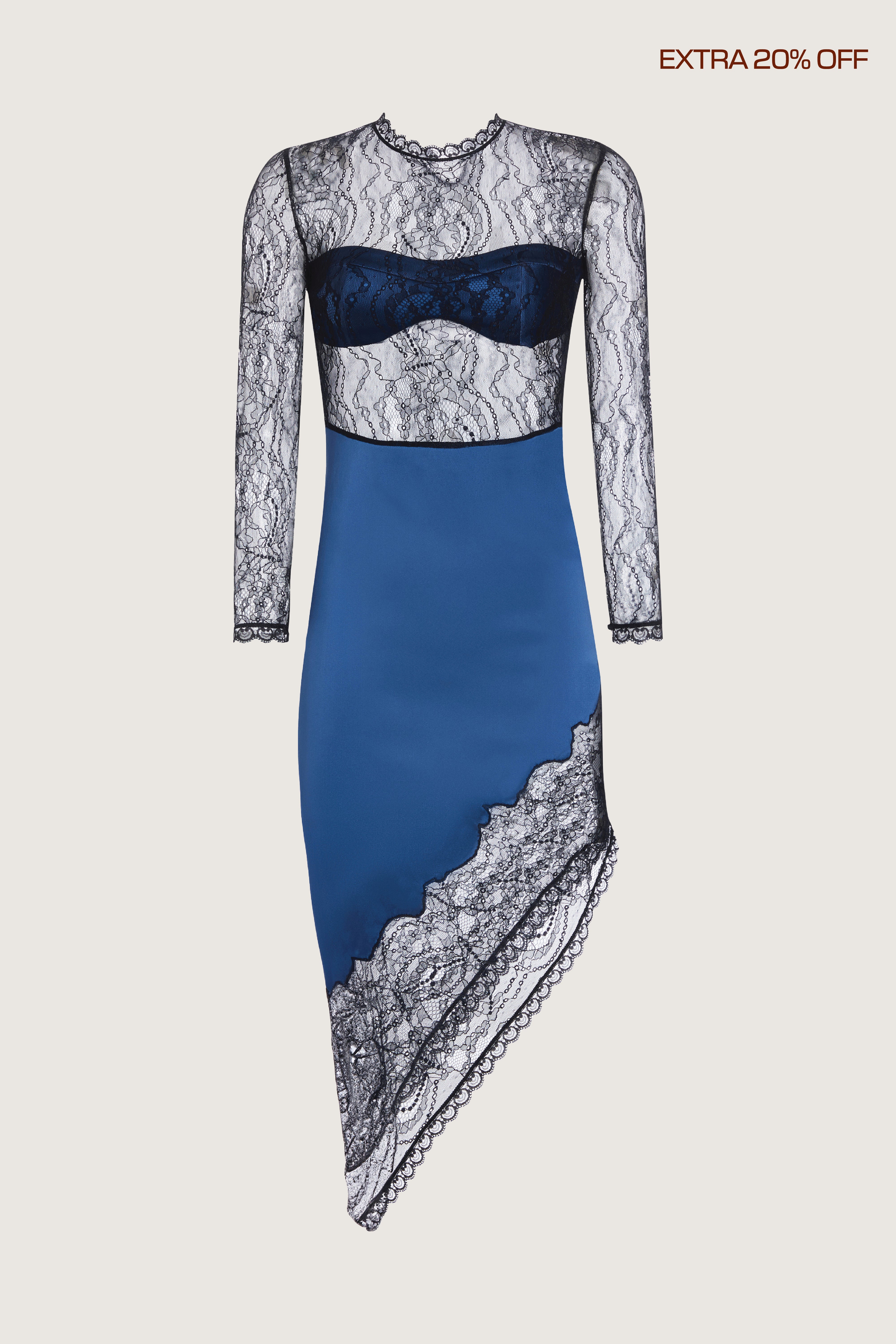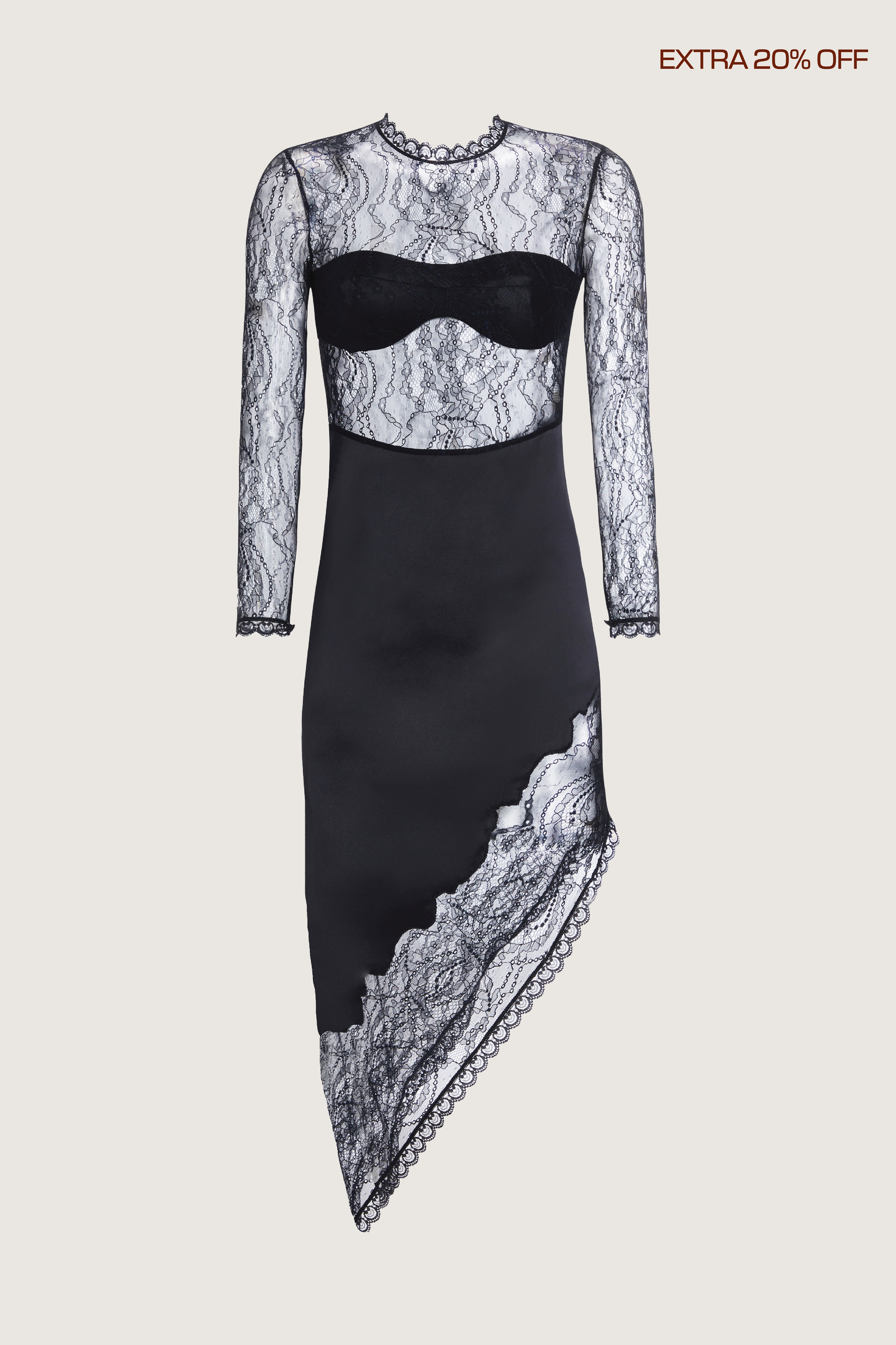 This stretch satin dress is cut for a slim fit with an asymmetrical, mid-length hemline. Featuring lace bodice, built-in satin finished curved bandeau, and satin covered buttons at back of neck and wrists.. Hand-made in India.
