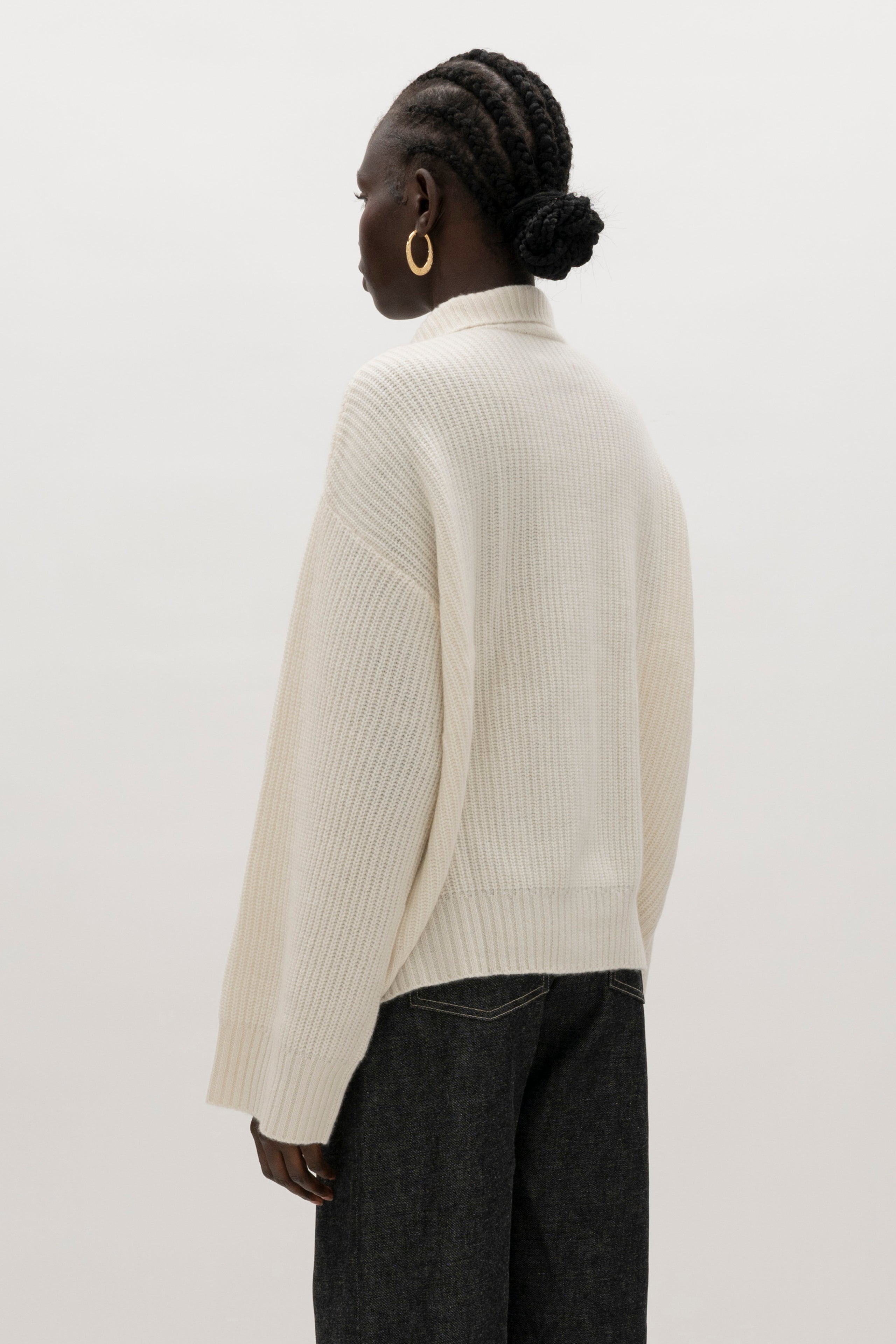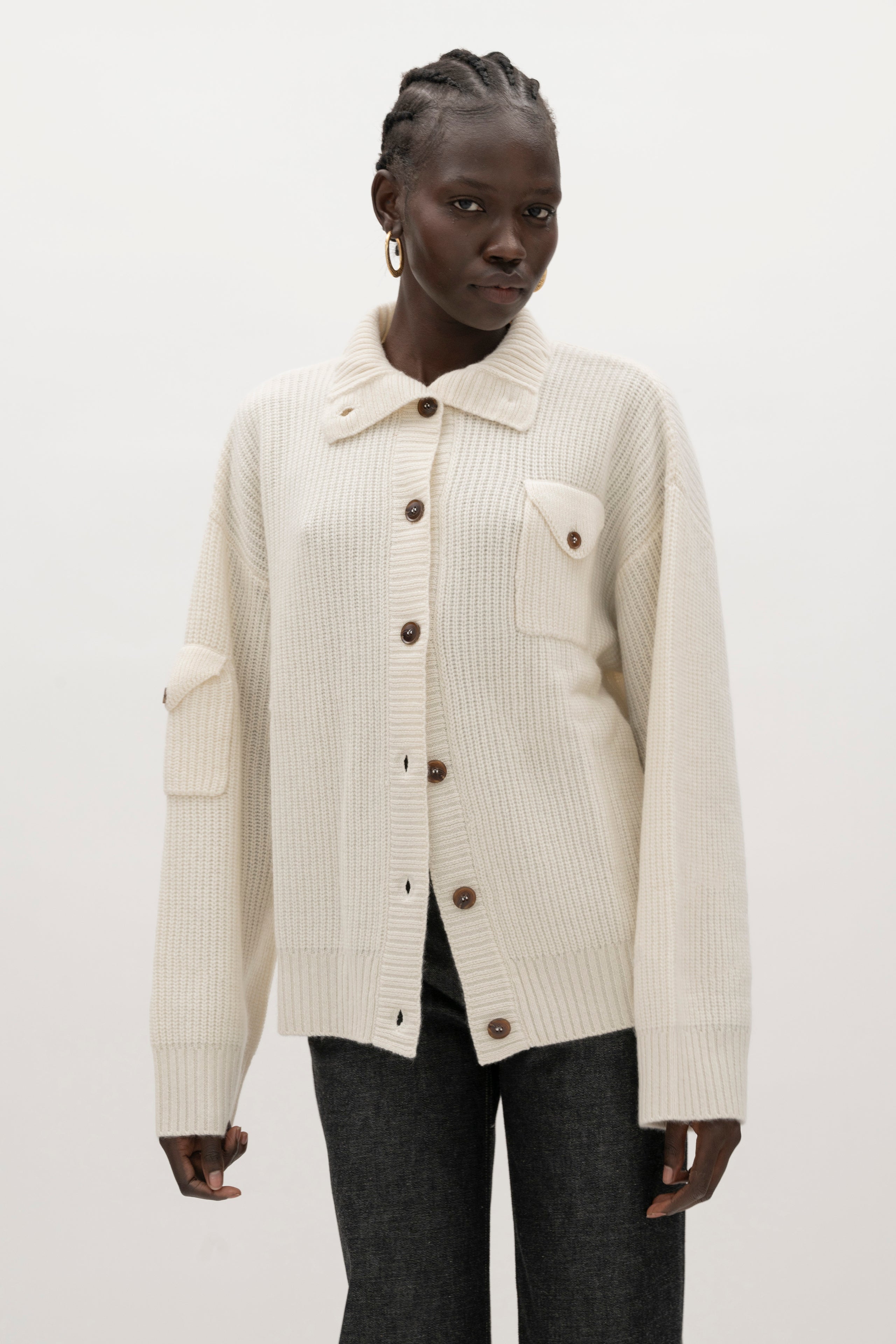 This 100% royal cashmere cardigan features an oversized silhouette that hits below the hip, perfect for layering. Features horn buttons along with pockets at chest and right sleeve. Can be worn open or buttoned up as a turtleneck.