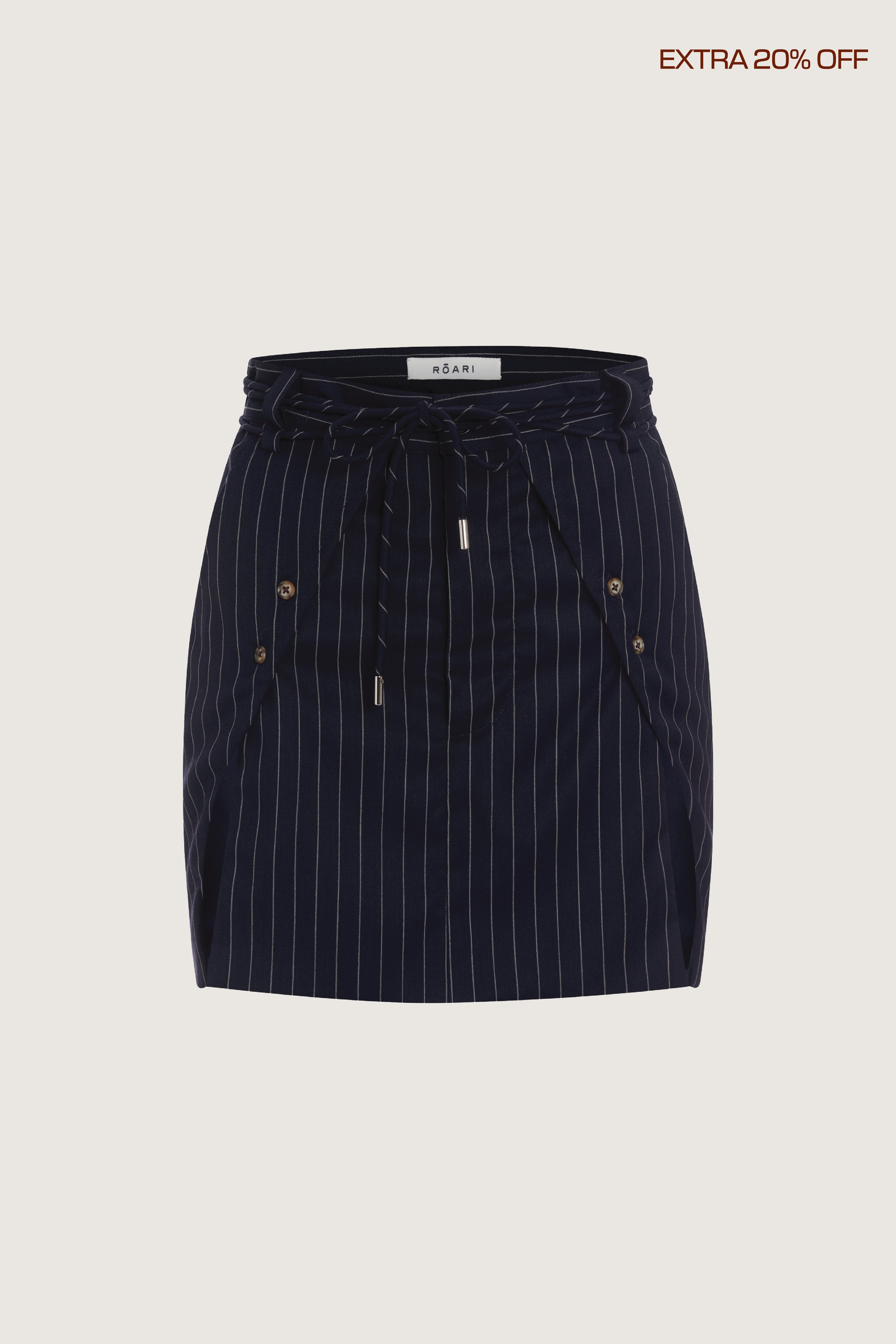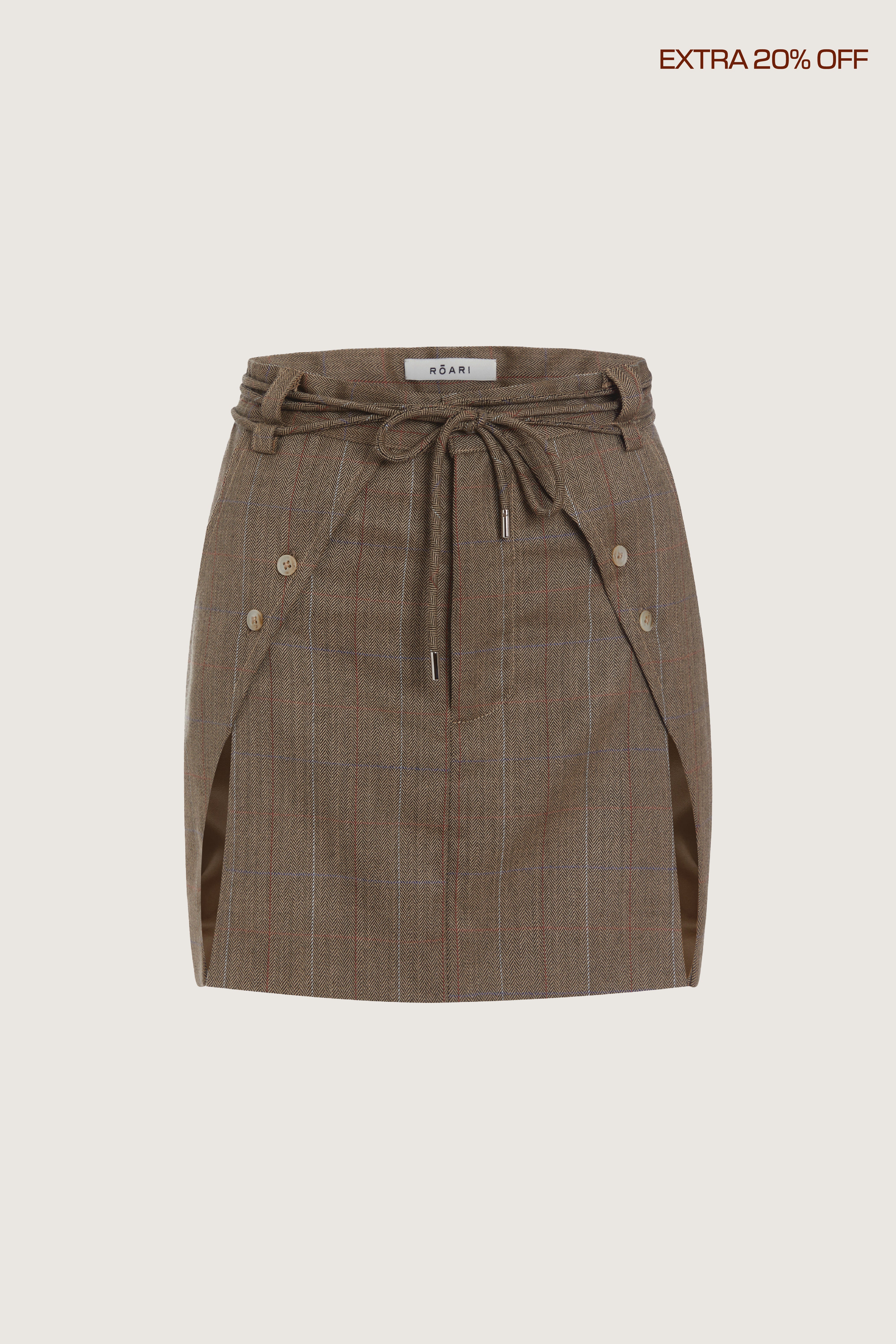 Paneled skirt featuring a self-fabric waist tie tunneled through two rows of belt loops. Double front vents are secured by horn buttons. Slightly lengthened back for added coverage.