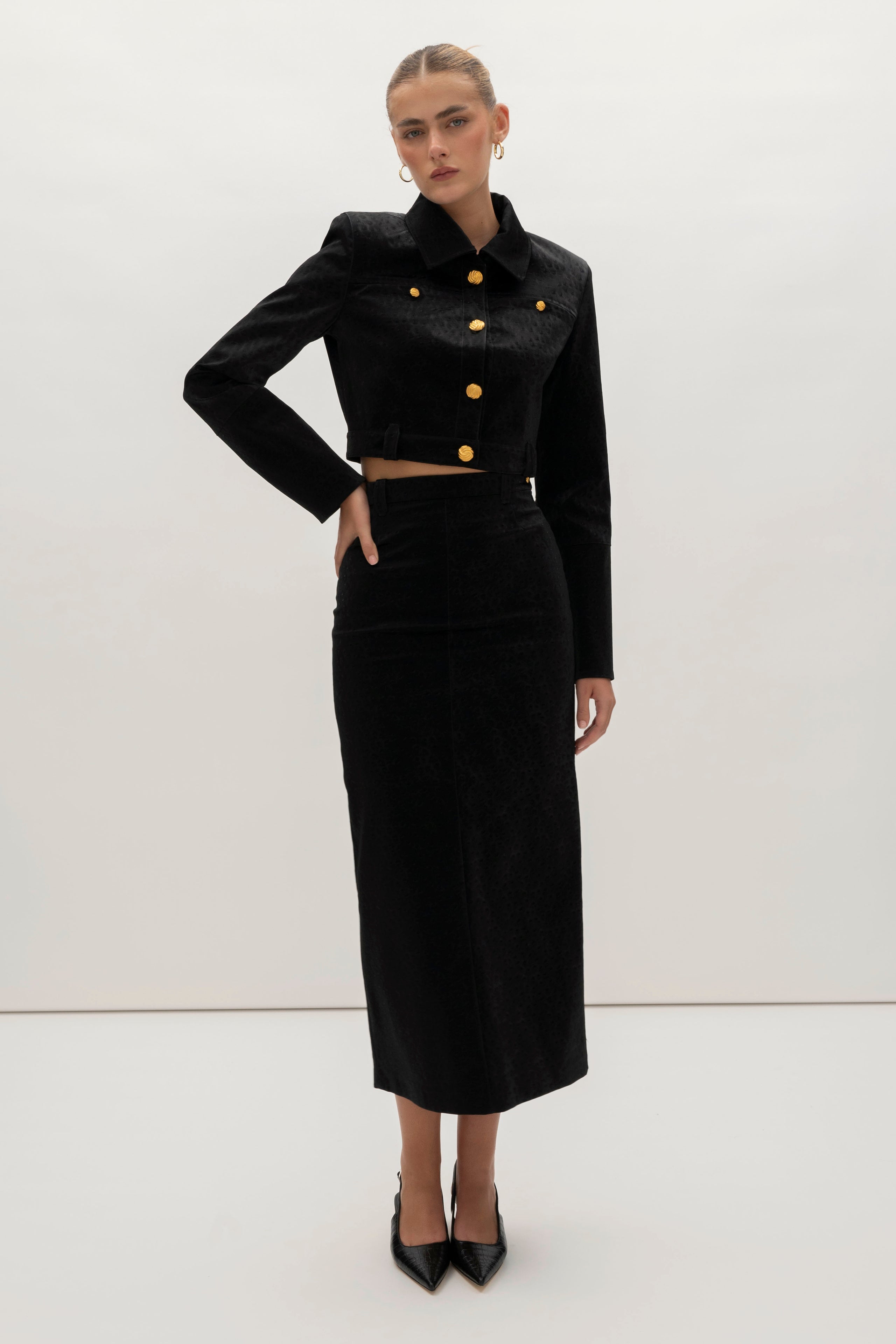 A fresh take on the classic pencil skirt, this style is crafted with vegan ostrich- embossed leather. It features belt loops for effortless styling and is finished with ROARI's signature gold knot button at left hip. Fully lined.